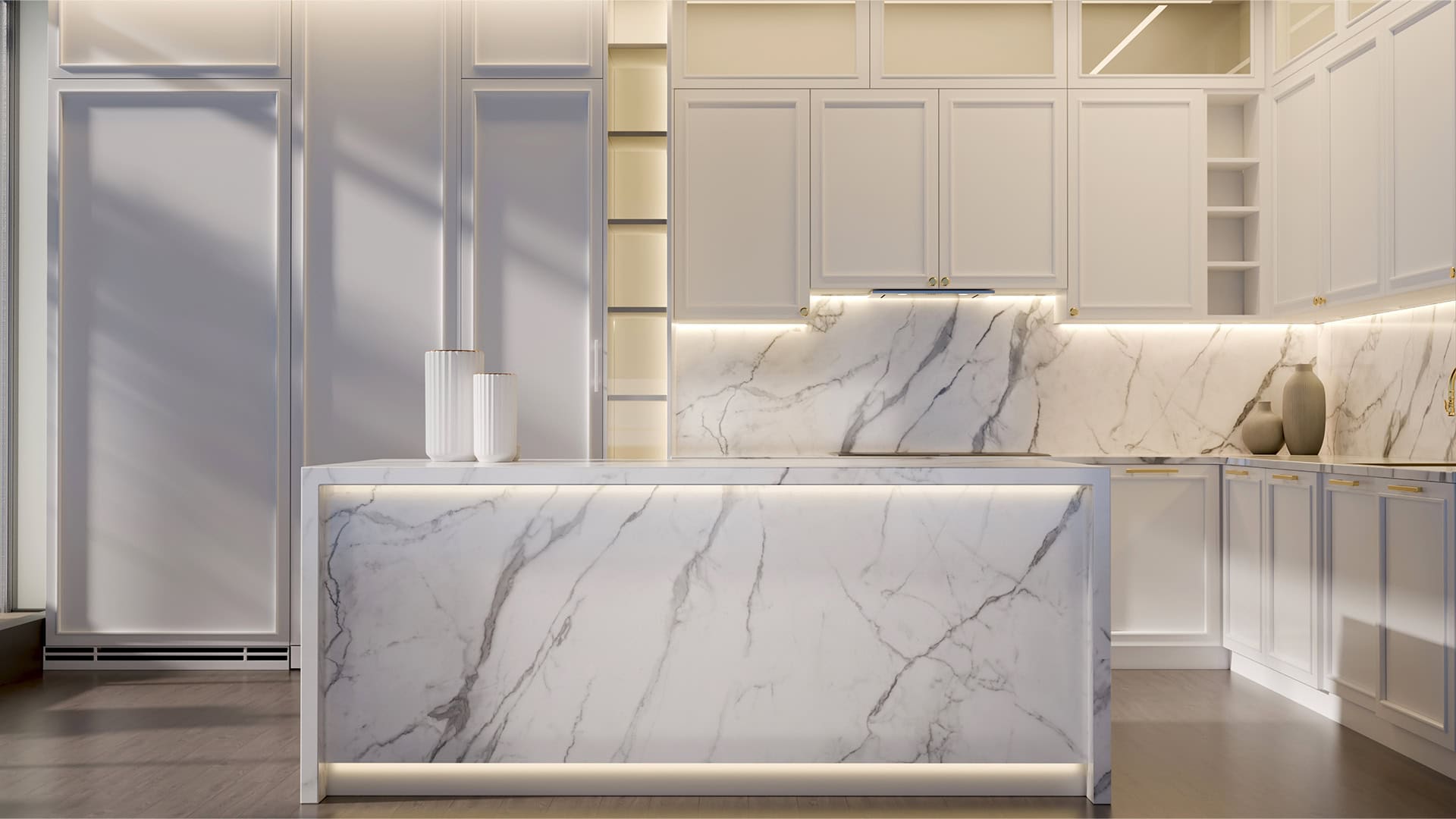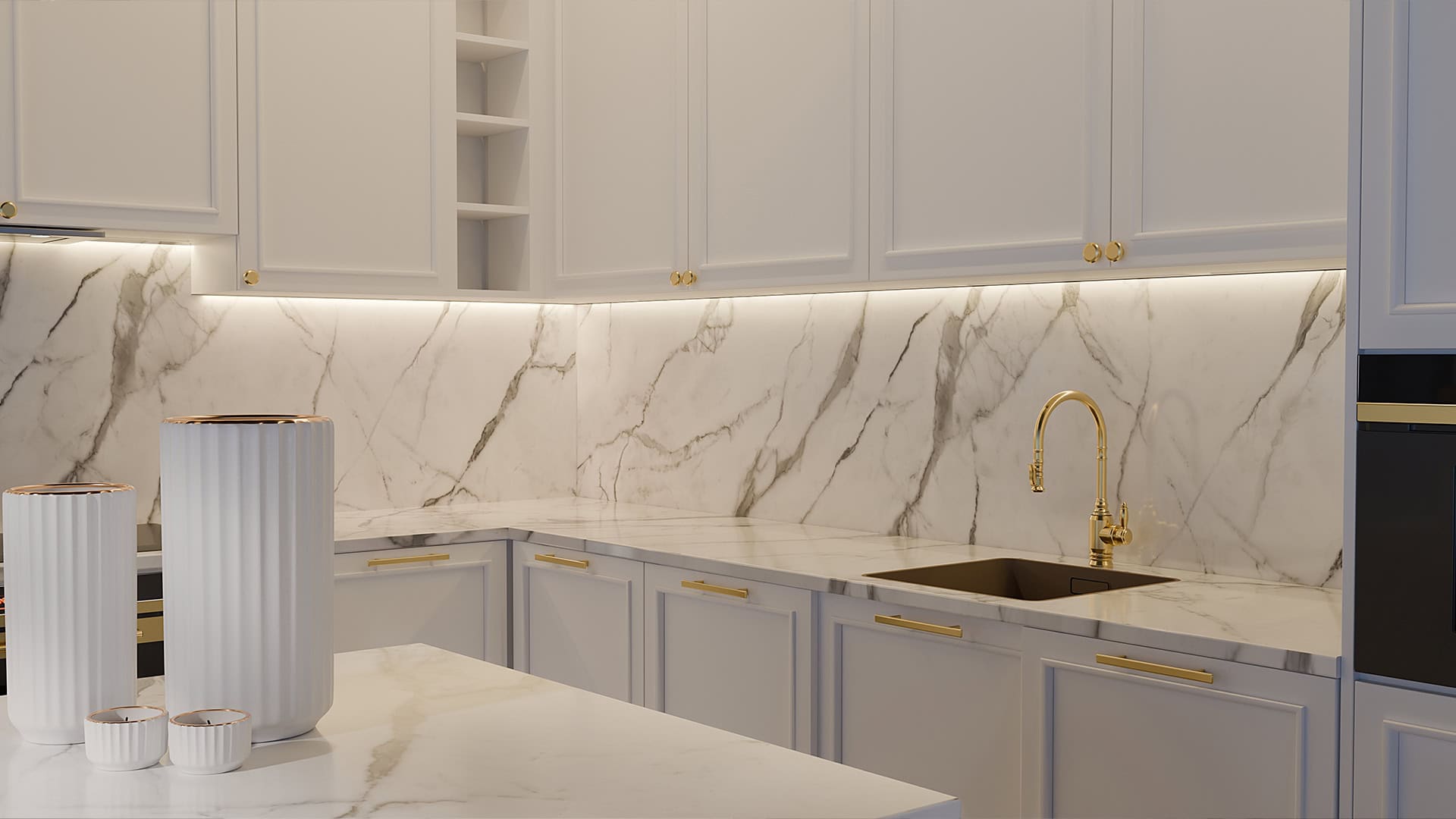 interioare luxury-minimal și amenajări rafinate, unde blatul devine piesa principală a spațiului.