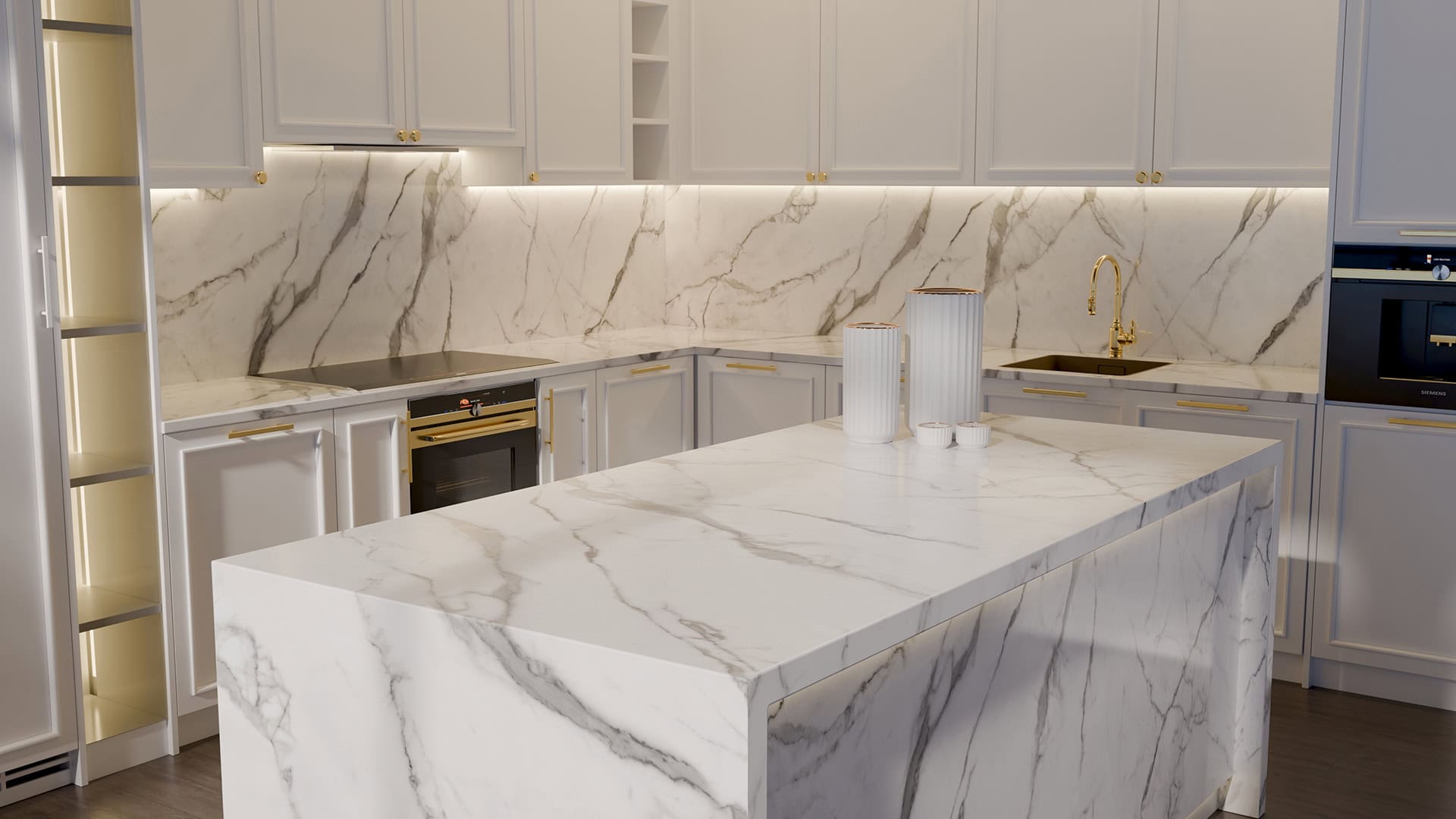 Pentru un rezultat spectaculos, combină Calacatta Lal cu fronturi albe/greige, mânere aurii sau negre, iluminare caldă sub corpuri și un backsplash în aceeași textură pentru continuitate vizuală.