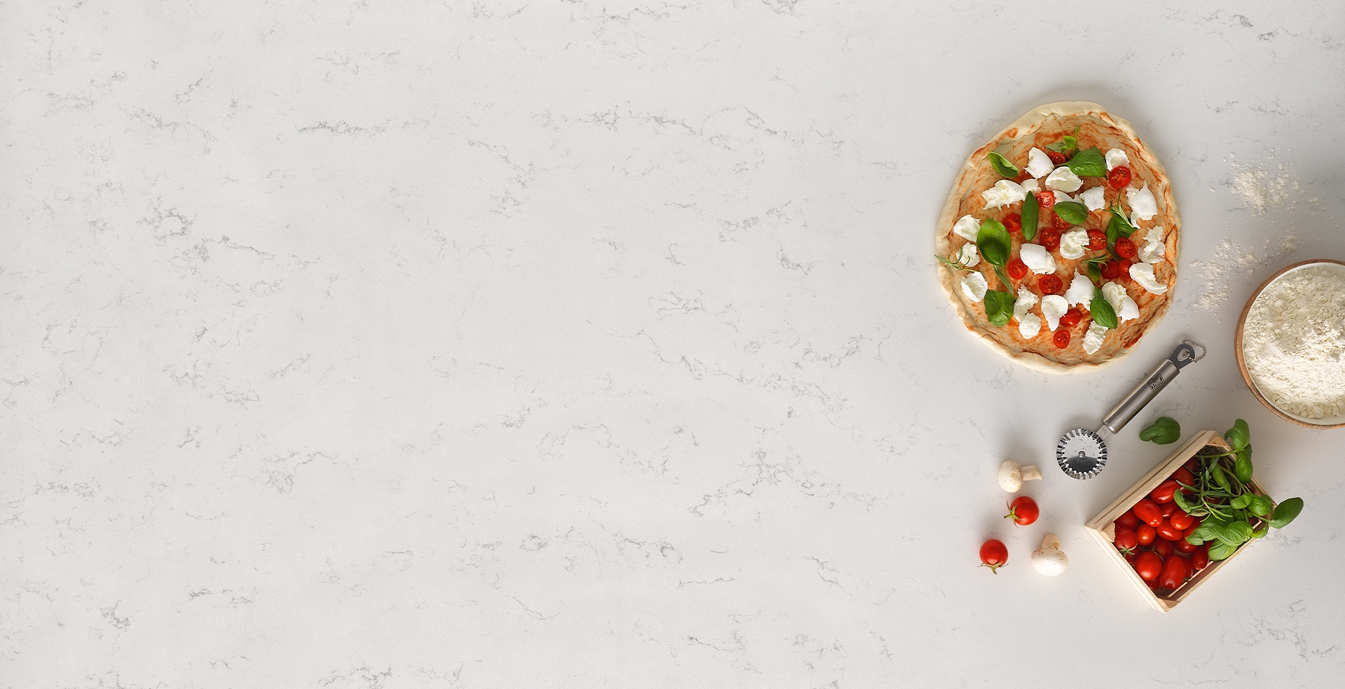 Blaturile fabricate pe comanda din quartz compozit Belluno se evidențiază printr-un fond alb luminos al suprafetei, impregnat cu venaturi fine și delicate în tonuri gri-calde, distribuite uniform.