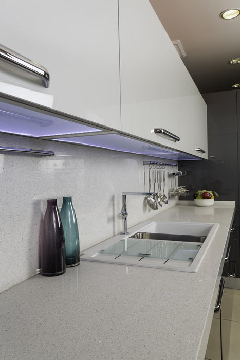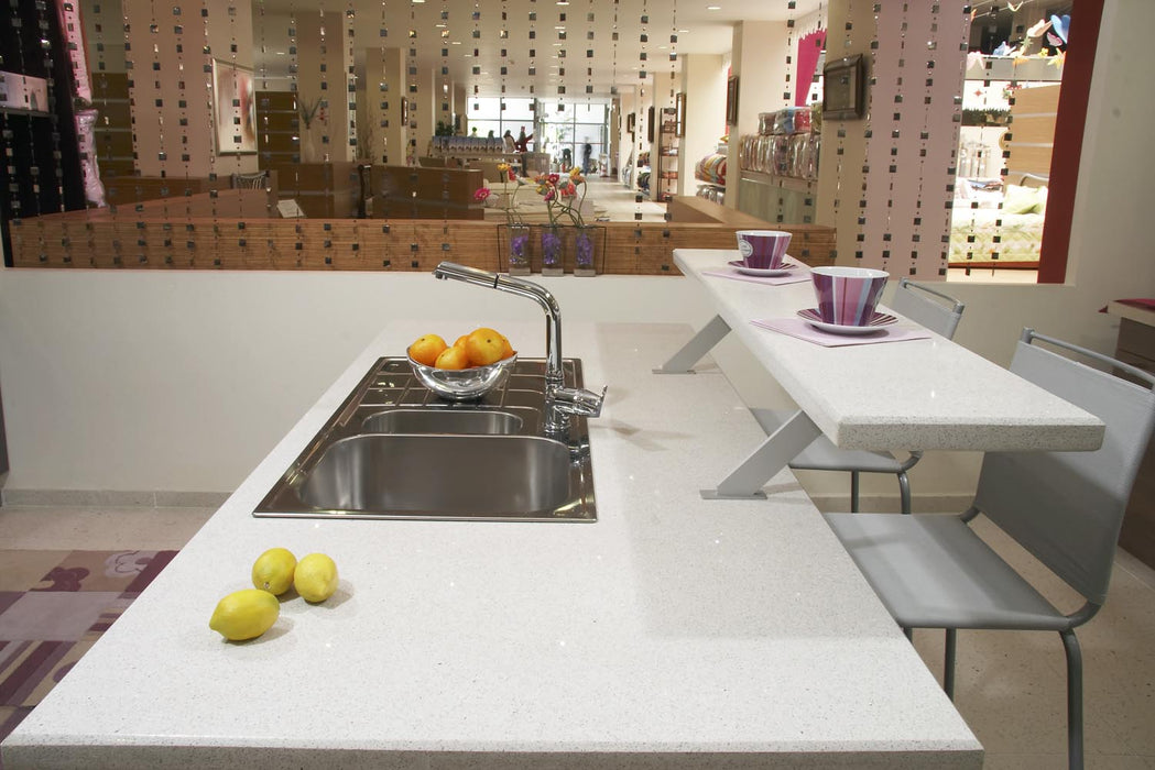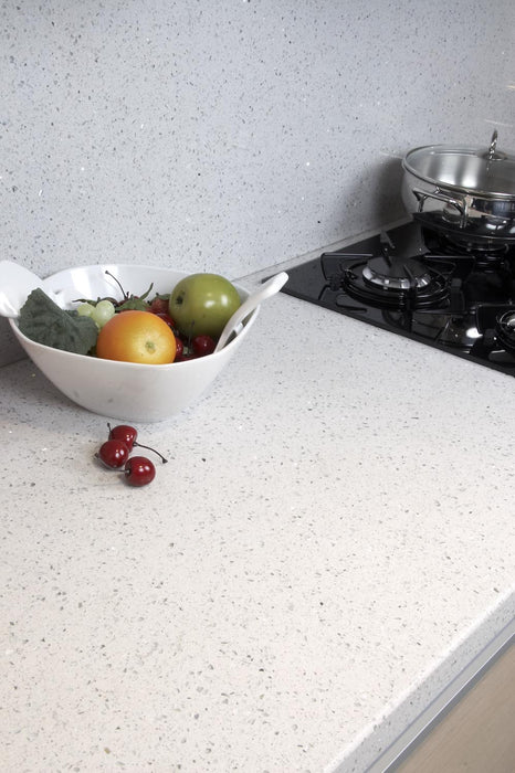 LAPLAND este o nuanță de quartz compozit extrem de apreciată, cu un ton alb rafinat și un efect de strălucire aparte datorită particulelor mici de cristale uniform distribuite în întreaga masă a produsului. Ideal pentru a adăuga un aer elegant și modern oricărui spațiu.