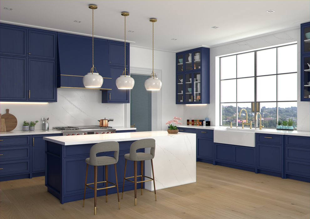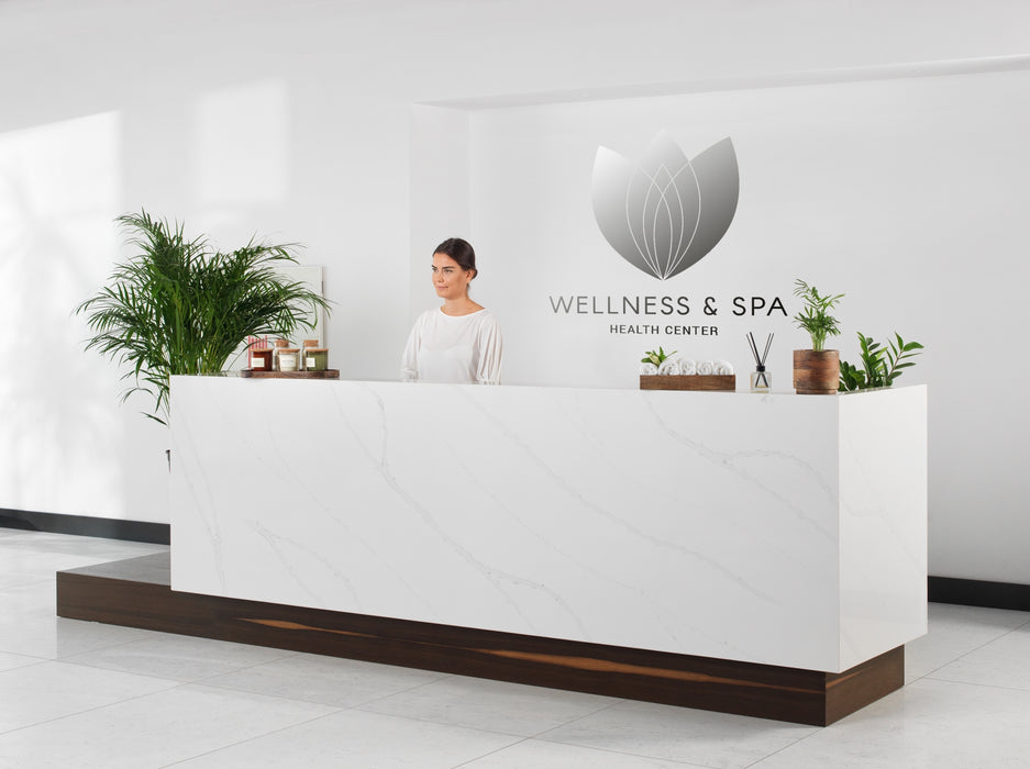 Blat realizat din quartz compozit cu finisaj de marmură Calacatta, având un fond alb și venaturi subtile alb-gri, ce oferă un aspect elegant și natural, potrivit pentru spații moderne și rafinate.