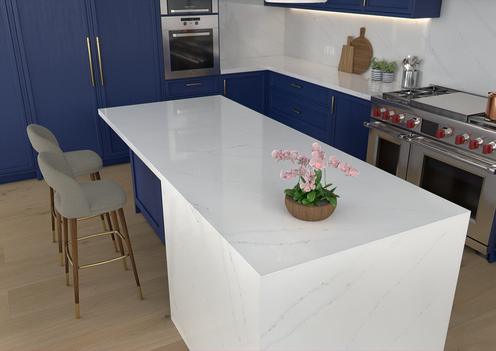 Blat din quartz compozit – finisaj tip Calacatta, cu venaturi alb-gri