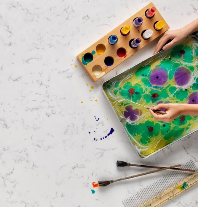 Blat realizat din quartz compozit cu finisaj alb marmorat, ce oferă un aspect elegant, inspirat din piatra naturală, potrivit pentru o varietate de spații moderne și profesionale.