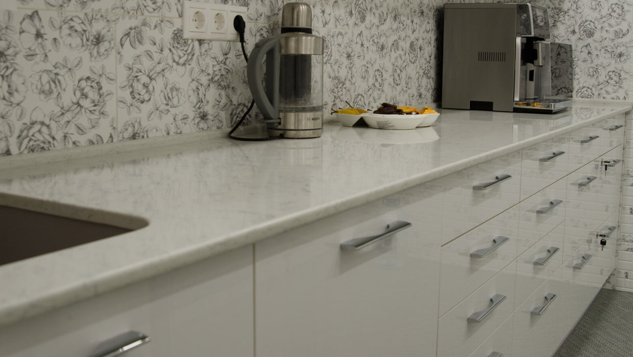 Material premium: Quartz compozit cu tonuri de alb-gri, finisaj lucios, venatură subtilă gri – un aspect clasic și sofisticat, inspirat de marmura Carrara.